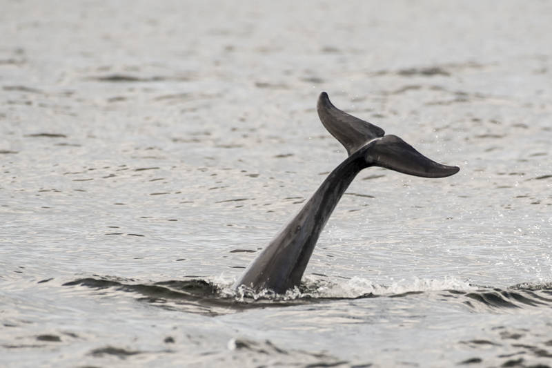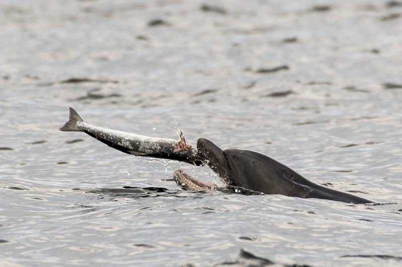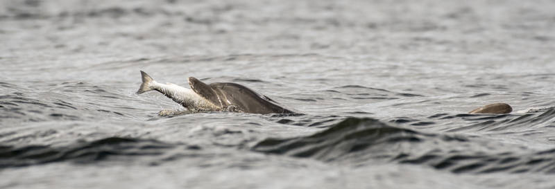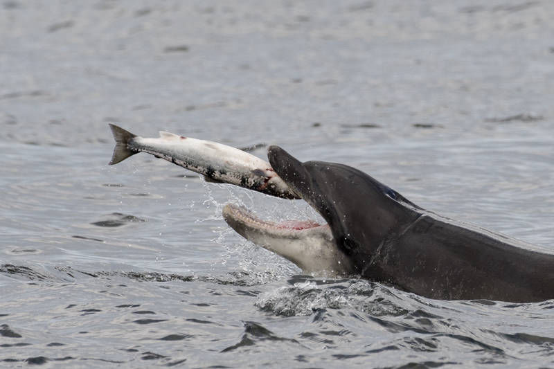 Le Tursiop ou Grand Dauphin est l’une des espèces de dauphins des plus connues. Dans la baie écossaise de Moray firth, qui donne sur la Mer du Nord, sa population profite de l’abondance des saumons lors de leur retour sur leurs zones de reproduction. Dans un spectaculaire festin, les salmonidés attrapés sont souvent projetés vers le haut afin d’être ingurgité, tête la première, dans le sens de la longueur.